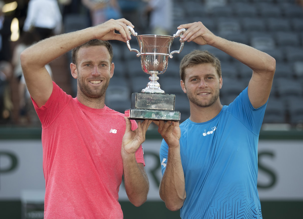 - Jun 10, 2017; Paris, France; Michael Venus (NZL) and Ryan Harrison (USA) at the mens doubles final trophy presentationn after their match against Santiago Gonzalez (MEX) and Donald Young (USA) on day fourteen of the 2017 French Open tennis tournament at Stade Roland Garros.