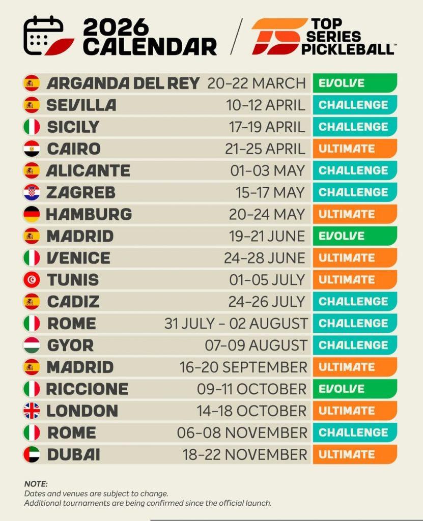 Dentro de este mapa internacional, España se posiciona como uno de los ejes principales del tour, con seis torneos confirmados, el mayor número de sedes de cualquier país. Las ciudades seleccionadas son Arganda del Rey, Sevilla, Alicante, Cádiz y dos citas en Madrid: una en junio, correspondiente a la categoría Evolve, y otra en septiembre, perteneciente a la categoría Ultimate. Esta presencia refuerza el papel de España como uno de los mercados más activos y estratégicos para el desarrollo del pickleball en Europa.